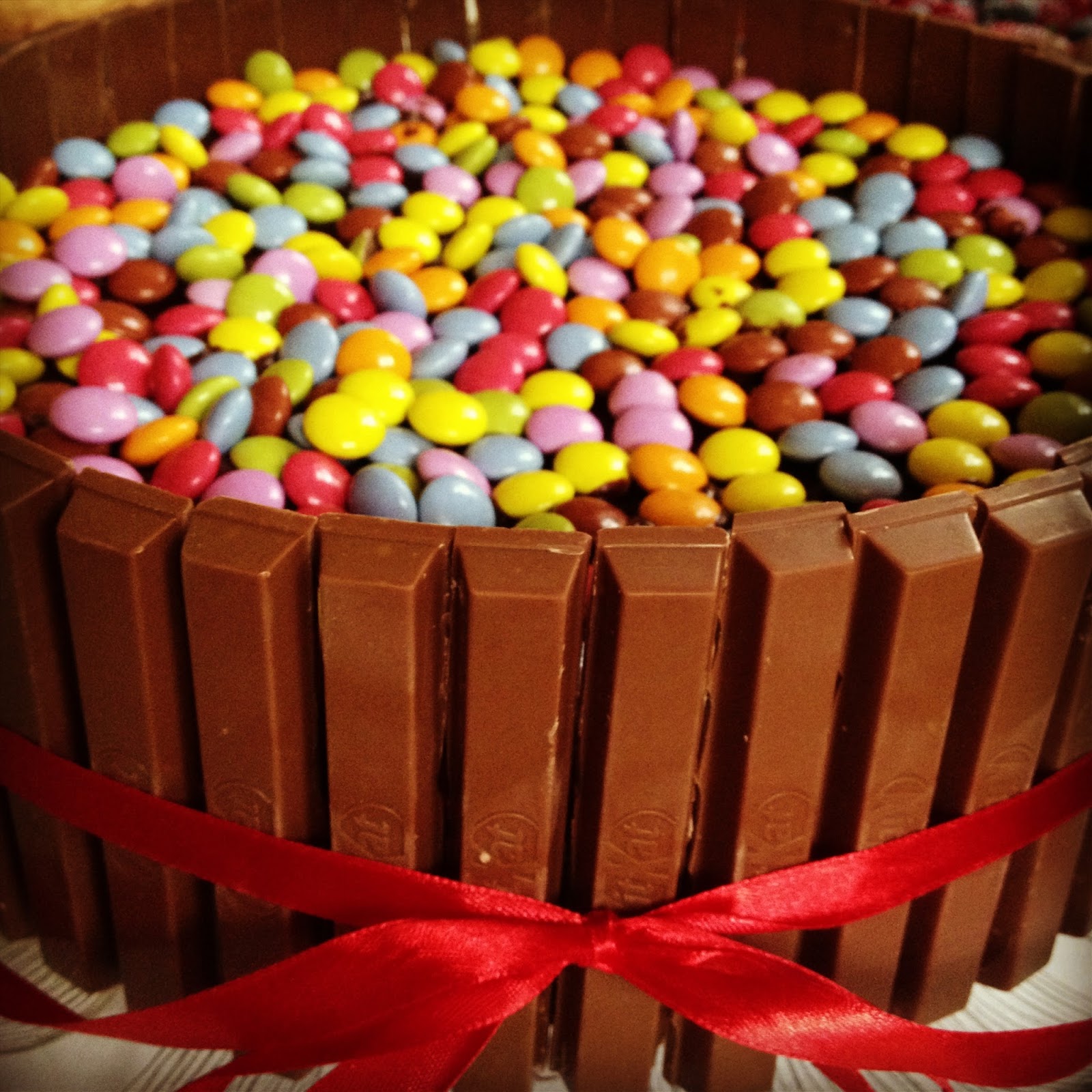 Para o bolo de Kit Kat e Smarties, barro o bolo com uma receita de ganache. Decorar os laterais com Kit Kat ( cerca de 10 embalagens ) e cobrir com Smarties ( 10 embalagens )